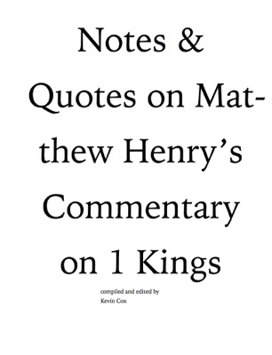 This is a compilation of excerpts from Matthew Henry’s Commentary on the book of 1 Kings. Mr. Henry added Notes to many of his chapters. These are those comments, plus other quotes that I thought were insightful.