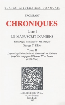 Les précédentes éditions des célèbres Chroniques de Froissart se sont heurtées au problème inextricable des "variantes". Les principaux manuscrits divergent tellement, que l'on ne peut plus parler de variantes, mais de nouvelles rédactions, entreprises par Froissart à divers moments de sa vie et selon des optiques différentes (voir G.T. Diller, Attitudes chevaleresques et réalités politiques chez F. dans nos "Etudes de philol. et d'hist.", No 39, 1984). De sorte qu'en voulant donner des "variantes" autour d'un "texte principal", les éditions de Siméon Luce et de Kervyn de Lettenhove ont fourni de véritables mosaïques de textes. M. Diller a choisi la voie qui s'impose: publier chaque manuscrit comme une oeuvre différente. Ainsi, il a donné le Manuscrit de Rome dans les TLF (No 194) en 1972. Voici maintenant le premier tome du Manuscrit d'Amiens.