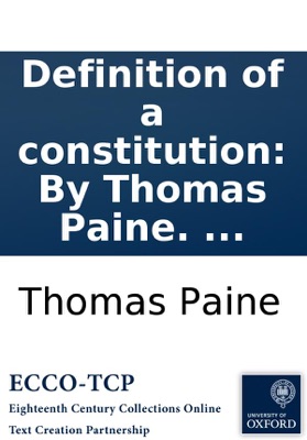 Definition of a constitution: By Thomas Paine. ..., Thomas Paine. Definition of a constitution: By Thomas Paine. ... Paine, Thomas, 1737-1809. [2],15,[1]p. ; 8⁰. London : printed for J. Debrett, 1791. Many copies lack full titlepage; Half-title: 'Notes upon Paine's rights of man.'. Reproduction of original from the John Rylands University Library of Manchester. English Short Title Catalog, ESTCN28189. Electronic data. Farmington Hills, Mich. : Thomson Gale, 2003. Page image (PNG). Digitized image of the microfilm version produced in Woodbridge, CT by Research Publications, 1982-2002 (later known as Primary Source Microfilm, an imprint of the Gale Group).
